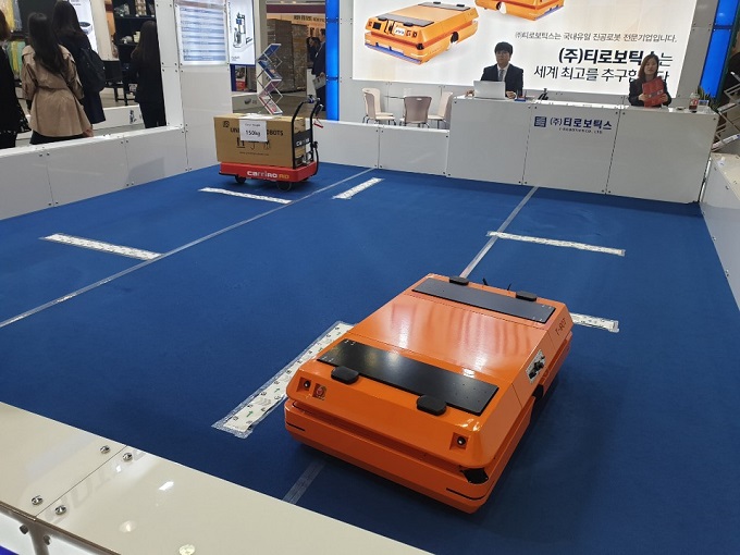 티로보틱스가 전시한 T-BOT L은 SLAM 기반의 이송로봇으로, 리프트 기능을 탑재해 고중량(1000kg) 화물을 자율주행해 이송한다. T-BOT L은 초음파센서 및 Lidar 센서를 탑재해 장애물 발견시 정지 또는 회피하여 주행한다. 그리고 충격방지센서가 탑재돼 있어서 충돌 발생시 긴급 정지한다. 고객사의 요구에 따라 협업로봇 또는 컨베이어 모듈의 탑재가 가능하다. 한번 충전으로 8시간 이상 운용이 가능하다.