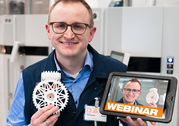 이구스의 적층 가공 책임자 톰 크라우제가 내마모성 소재의 플라스틱 기어 프린팅에 관해 웹 세미나를 연다.