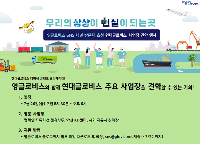 글로벌 SCM 전문기업 현대글로비스는 대학생 기자단 ‘영글로비스(Young GLOVIS)’의 온라인 홍보채널을 방문한 대학생들을 초청해 사업장을 견학하는 행사를 오는 7월 26일에 실시한다고 밝혔다.