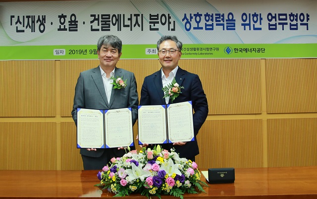 한국에너지공단(김창섭 이사장)과 한국건설생활환경시험연구원(윤갑석 원장)은 9월 10일(화) 서울 서초구 소재 한국건설생활환경시험연구원에서 신재생, 효율, 건물에너지 분야 상호협력을 위한 업무협약을 체결했다.