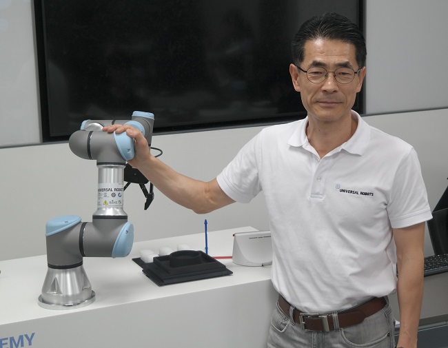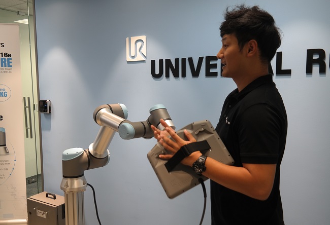 ▲ 유니버설로봇 한국지사의 심재호 과장이 ‘UR16e'를 직접 시연해보이고 있다.