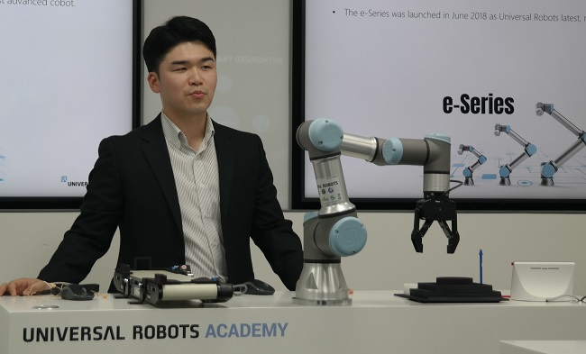 ▲ 유니버설로봇 한국지사의 김영우 과장이 ‘UR16e'에 대해 소개하고 있다.