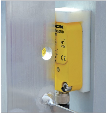▲ Bi20-Q20 유도형 근접센서로 작업 케이지의 외벽에 접힌 사다리를 감지한다.