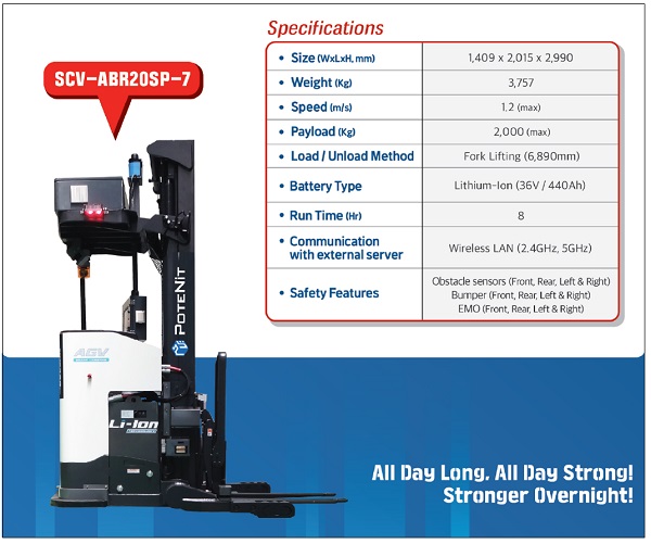 특히 포테닛은 미래 전략을 알리기 위해 전시부스에서 기술 집약적인 시연을 선보이고, 최신형 무인지게차 ‘SCV-ABR20SP-7’을 공개할 예정이다.