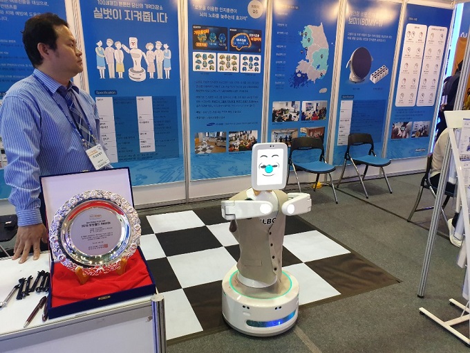 로보케어는 전국 보건소나 치매안심센터에 사용하는 그룹형(8~12명) 인지훈련로봇인 ‘실벗(SILBOT)‘을 전시했다.