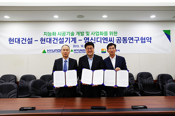 현대건설기계는 지난 28일 경기도 용인시에 위치한 현대건설 연구개발본부에서 현대건설(대표 박동욱), 영신디엔씨(대표 강일형)와 ‘스마트 건설을 위한 건설 자율화/자동화 기술 사업화 공동협약’을 체결했다.