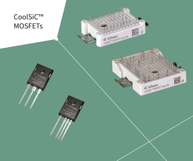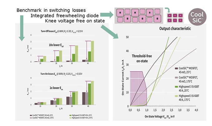인피니언은 최근에 650V CoolSiC™ MOSFET 제품을 추가함으로써 포괄적인 구성의 650V 제품 포트폴리오를 갖추게 되었다. 이 블로킹 전압 대로 IGBT와 성공적인 CoolMOS™ 기술에 더해서 이 기술을 추가함으로써 다양한 솔루션을 제공하게 되었다. 두 디바이스 모두 빠른 스위칭과 선형적 I-V 특성을 특징으로 한다. 하지만 SiC MOSFET은 하드 스위칭으로 바디 다이오드 동작을 가능하게 하고 10kHz 이상의 스위칭 주파수로 동작할수 있다.