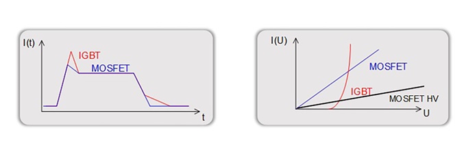 그림 1. MOSFET(HV는 IGBT와 같은 블로킹 전압 – 1200V 이상)과 IGBT의 스위칭 프로세스(왼쪽, 동일한 dv/dt)와 정적 I-V 동작(오른쪽) 비교