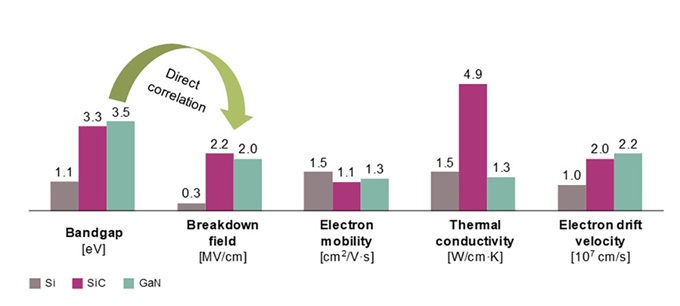 와이드 밴드갭 반도체를 사용하면 상황이 달라진다. 그림 2는 SiC 및 GaN과 실리콘의 물리적 특성을 비교하고 있다. 중요한 것은, 밴드갭과 반도체의 임계 전계 사이에 직접적인 상관관계가 있다는 것이다. SiC가 Si에 비해서 항복 전계가 약 10배 더 높다.