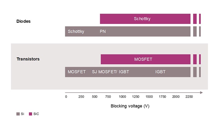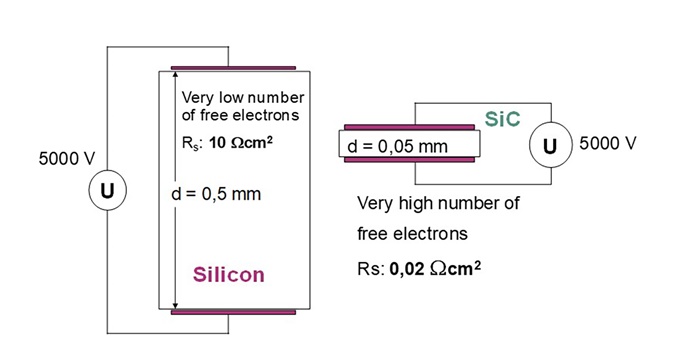 SiC는 항복 전계가 10배 높으므로 활성 영역을 훨씬 더 얇게 할 수 있으며 동시에 훨씬 더 많은 자유 캐리어를 포함 시킬 수 있다. 그러므로 전도도가 훨씬 더 높다. SiC의 경우에는 MOSFET이나 쇼트키 다이오드 같은 고속 스위칭 유니폴라 디바이스가 IGBT와 p-n 다이오드 같은 느린 바이폴라 구조보다 블로킹 전압이 훨씬 더 높은 쪽으로 이동하고 있다는 것을 알 수 있다(그림 4). 이는 다시 말해 서, 실리콘을 사용해서 50V 부근의 저전압으로 가능했던 것들이 SiC를 사용해서 1200V 디바이스로도 가능하게 되었다는 것을 뜻한다.