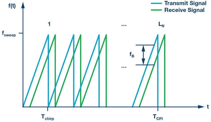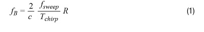 주파수 차이(fb, 비트 주파수)는 표적까지의 거리 R에 비례하며, 다음과 같은 공식으로 표현할 수 있다: