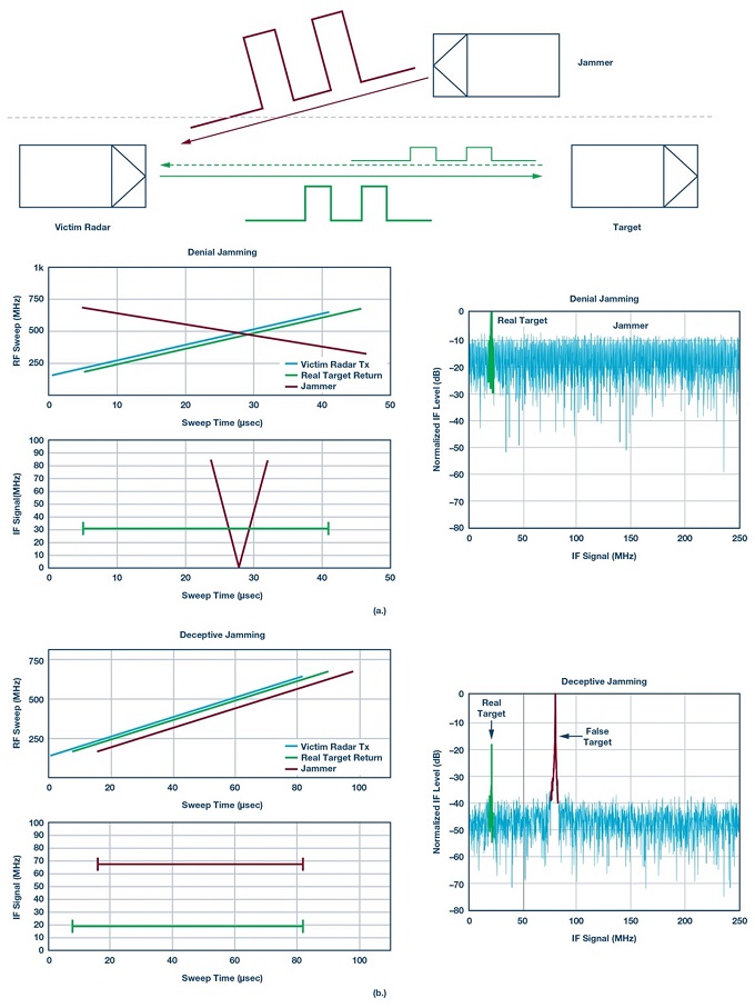 그림 2. a) FMCW 잡음 재밍, b) FMCW 기만 재밍