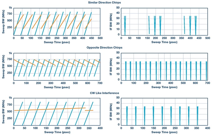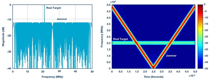 같은 방향 또는 반대 방향 재밍 FMCW나 심지어 CW와 유사한 느린 처프도 IF 신호에 유사한 영향을 미친다. 이러한 모든 재밍 시나리오의 경우에, 빠르게 움직이는 V자 형태의 IF 신호가 정규적인 FFT 도메인에서 잡음 플로어를 상승시킨다[그림 3].