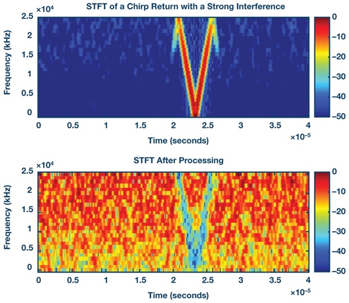 [그림 5]에서 위쪽 그림은 강력한 재머이고, 아래쪽 그림은 처리를 한 다음의 STFT이다. 위쪽 그림을 보면, 강한 재머가 존재할 때 많은 실제 표적들이 보이지 않는다는 것을 알 수 있다. 아래 그림에서는 V자 형태의 재머가 삭제되고 다시 시간 도메인으로 변환했을 때 SNR이 낮은 실제 표적들을 구분할 수 있게 된다.