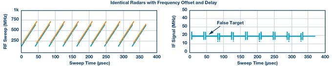 각각의 레이더 센서로 암호화 RF 서명을 사용함으로써 리턴 신호를 인증할 수 있다. [그림 6]은 2개의 동일한 레이더(하나는 다른 자동차에 탑재)가 주파수 오프셋과 지연을 사용해서 피해 레이더로 허위 표적을 생성하는 것을 보여준다. 재밍 레이더가 피해 레이더와 시간적으로 일치하도록 정렬되는 것이다(동일한 처프 기울기와 짧은 오프셋).