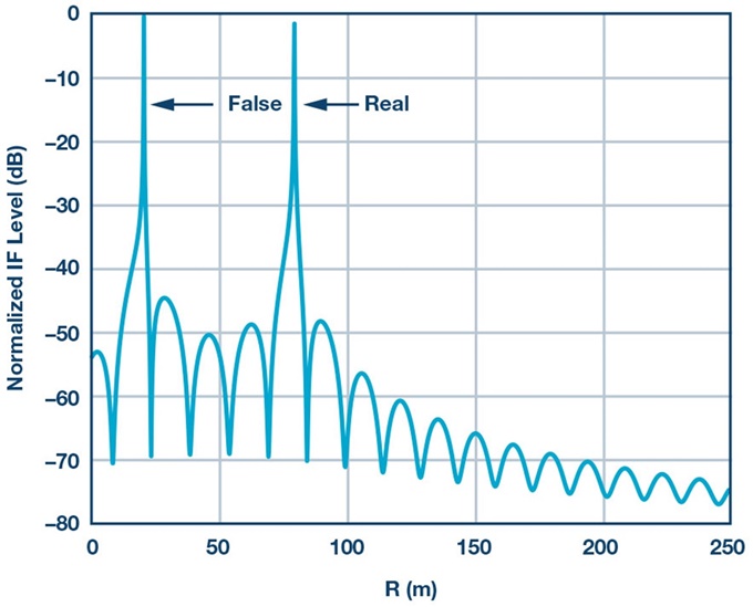 재밍은 FMCW 레이더 센서들이 주파수 대역에서 동일한 비율로 동작하는 혼잡한 RF 환경에서 발생할 수 있다. [그림 2]는 마주보고 달려오는 자동차의 재밍 사례를 보여준다.