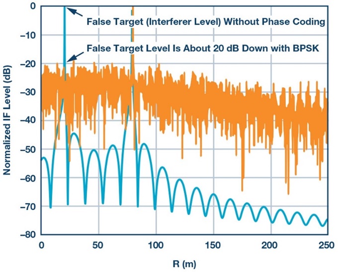 이 경우에는, 위상 코드화 FMCW 레이더가 뛰어난 재밍 견고성을 달성할 수 있다. 또한 직교 코드를 사용하면 여러 개의 파형을 동시에 송신할 수 있어 MIMO 레이더 동작이 가능하다.
