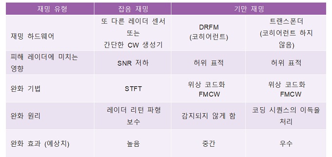 첨단 신호처리 알고리즘과 복잡한 파형 생성 기법을 사용함으로써 혼잡한 자동차 레이더 센서 환경에서의 재밍을 완화할 수 있다. STFT 기반 신호처리 기법은 잡음 재밍 공격에 사용하기에 유용하다. 위상 코드화 FMCW는 이득 처리와 가로채기 회피를 사용해서 코히어런트 하지 않거나 코히어런트한 기만 공격에 대해서 추가적으로 견고성을 높일 수 있다. [표 1]은 다양한 완화 기법들을 요약해서 보여준다.