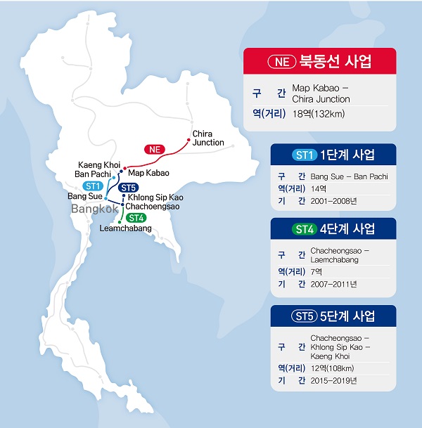 이 사업은 태국 철도 인프라 현대화 프로젝트 9단계 사업(ST9)으로 북동부 지역개발 및 화물, 여객 운송 능력 확대를 위해 ‘맙카바오(Map kabao)-타논지라(Chira Junction)’ 구간 총 연장 132km 철도를 복선화하고 20년 이상 된 노후 시스템을 전면 교체하는 프로젝트다.