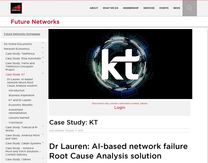 KT(회장 황창규)는 자체 개발한 인공지능 기반 통신 장애 분석 솔루션 ‘닥터 로렌(Dr. Lauren)’이 ‘세계이동통신사업자연합회(GSMA)’의 ‘사례 연구(Case Study)’로 선정돼 그 동안 연구 결과가 세계이동통신사업자연합회 홈페이지에 공개됐다고 3일 밝혔다.