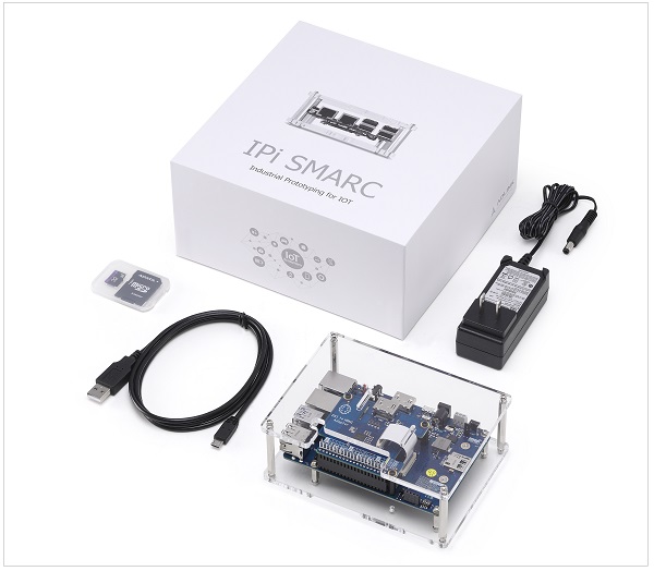 에이디링크 I-Pi SMARC 개발 키트는 I-Pi 캐리어 보드, LEC-PX30 SMARC 모듈, 전원 공급 장치, USB 프로그래밍 케이블, Linux OS가 포함된 SD 메모리 카드, 보호 및 액세스 균형을 위한 투명 아크릴이 포함되어 있다.