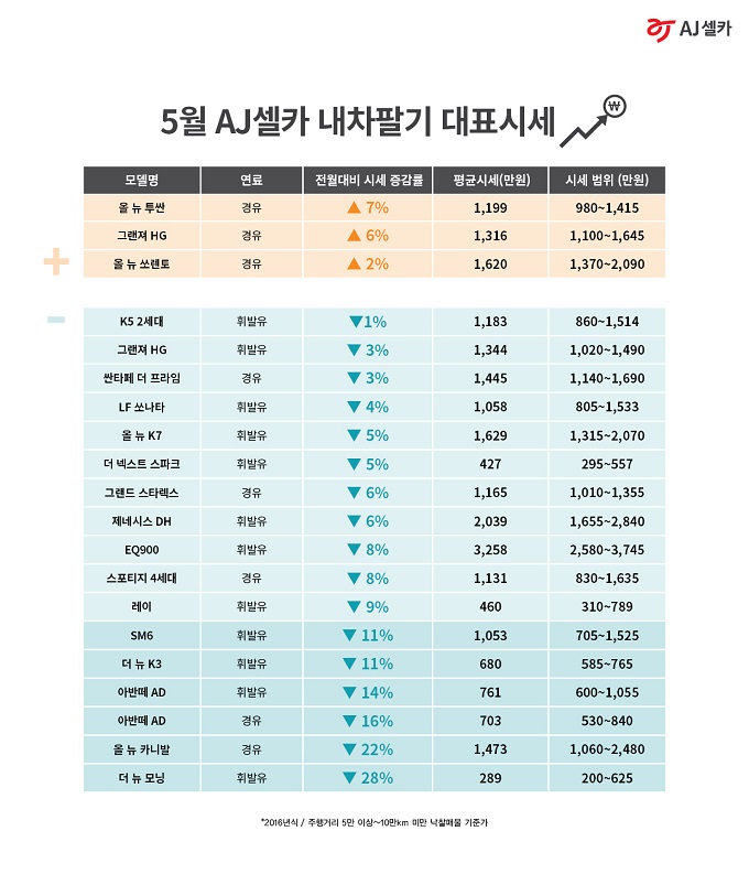 AJ셀카, 5월 내차팔기 대표시세 공개…코로나19 장기화로 중고차 시세 평균 7% 감소