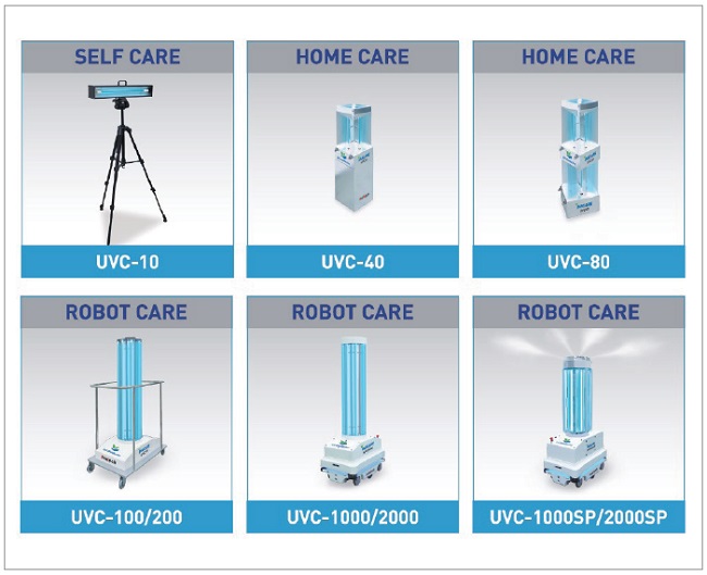 UVC-1000/2000과 UVC-1000SP/2000SP는 자율주행로봇이 적용된 무인 자동화 살균 시스템이다. UVC-1000SP/2000SP는 인아케어 시리즈의 최상위 모델로, UVC 램프 상단에 초미립자 약액 스프레이 기능이 탑재됐다. 인체에 무해한 친환경 약액은 살균광이 도달하지 못하는 음영지역까지 99.9% 살균한다. UVC-1000/2000은 약액 분사 기능이 제외된 모델이다. 이 두 모델은 기기 하부 자율주행로봇을 통해 저속주행살균이 가능하며, 웹 기반의 사용자 인터페이스로 공간 맵핑과 옵션 편집이 가능해 넓은 공간도 무인 방역할 수 있다.