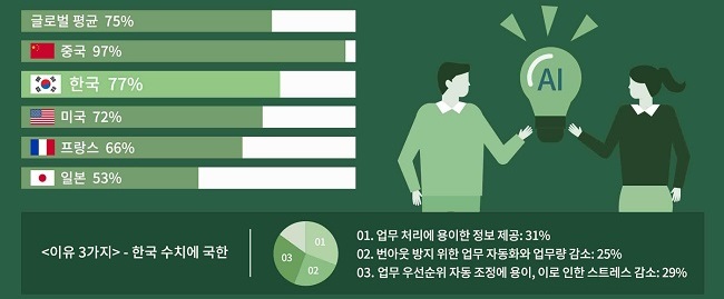 응답자의 75%가 직장에서의 정신건강을 증진하는데 AI가 도움이 된다고 평가했다. 한국도 77%의 응답자가 AI 활용에 대해 긍정적으로 답했으며, 특히 업무 효율성과 생산성을 높이는데 있어 효과적이라고 평가했다. 가장 큰 이점으로는 효과적인 업무 수행을 위해 필요한 정보 제공(31%), 업무 자동화와 업무량 감축(25%), 업무 우선순위 조정으로 인한 스트레스 감소(29%) 등이 꼽혔다.
