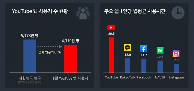 지난달 유튜브 앱 국내 사용자는 약 4천319만명이었다. 한국 인구(5천178만명)의 약 83%에 달하는 수치다.