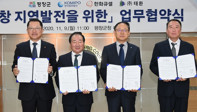 한화큐셀(사장 김희철)이 풍력발전사업을 추진한다. 한화큐셀은 지난 9일 강원도 평창군청에서 평창군(군수 한왕기), 한국중부발전(사장 박형구), 태환(사장 이기경)과 평창 지역 풍력발전사업 협력을 위한 양해각서(이하 MOU)를 체결했다.