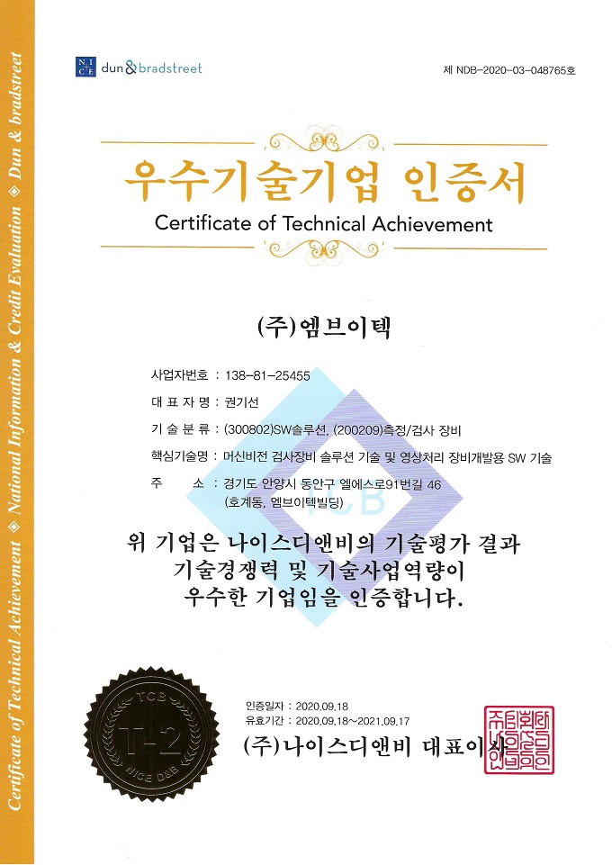 머신비전 전문업체인 엠브이텍이 지난 9월 기업신용정보 제공기관인 나이스디앤비로부터 우수기술기업 인증서를 획득했다고 밝혔다. 특히, 최상위 등급인 T2를 받아 기술력을 입증했다.