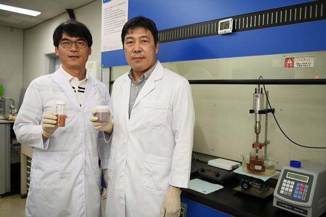 ▲기술 개발자인 정희진 박사(좌)와 이건웅 박사(우)가 전도성 금속잉크를 들고 포즈를 취하고 있다. (출처 : 한국전기연구원)