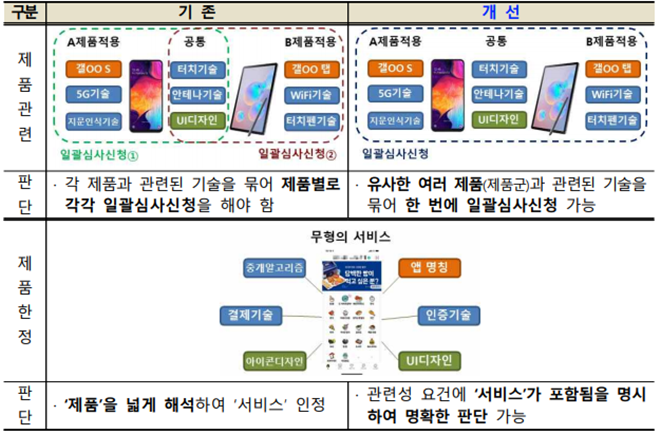 그러나 기존의 일괄심사제도는 신청요건이 ‘하나의 제품’ 관련으로 제한되어 있어 부품이나 장비 등 눈에 보이는 형태에 대해서만 지재권이 인정됐고, 스마트폰 앱과 같이 형태가 드러나지 않는 서비스는 심사가 어려웠다.