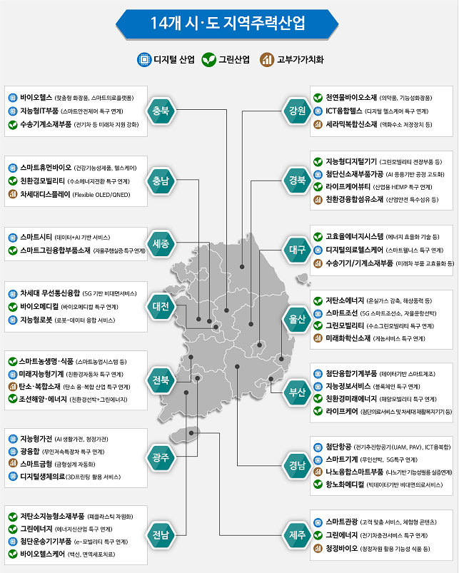 지역주력산업은 디지털 뉴딜 관련 산업 20개, 그린 뉴딜 관련 산업 19개, 지역기반산업의 고부가가치화를 위한 산업 9개 등이다.
