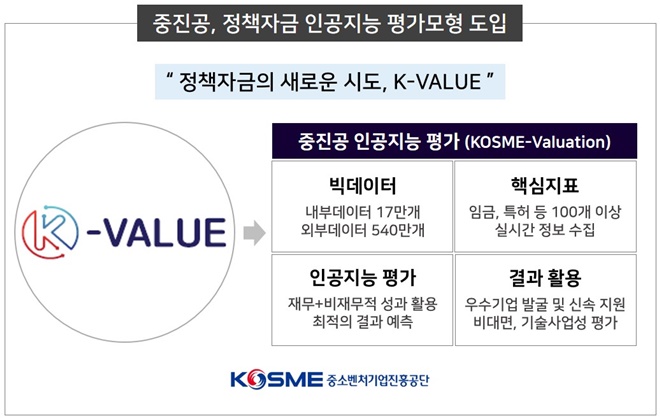중소벤처기업부와 중소벤처기업진흥공단은 정책자금 평가에 인공지능 평가모형 ‘K-VALUE’를 도입한다고 6일 밝혔다.