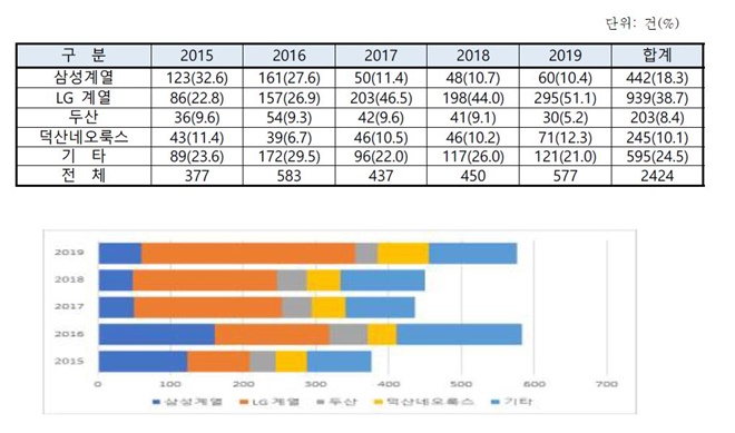 ▲국내 주요 OLED 소재 기업의 특허출원 동향 및 비중(15~19년)