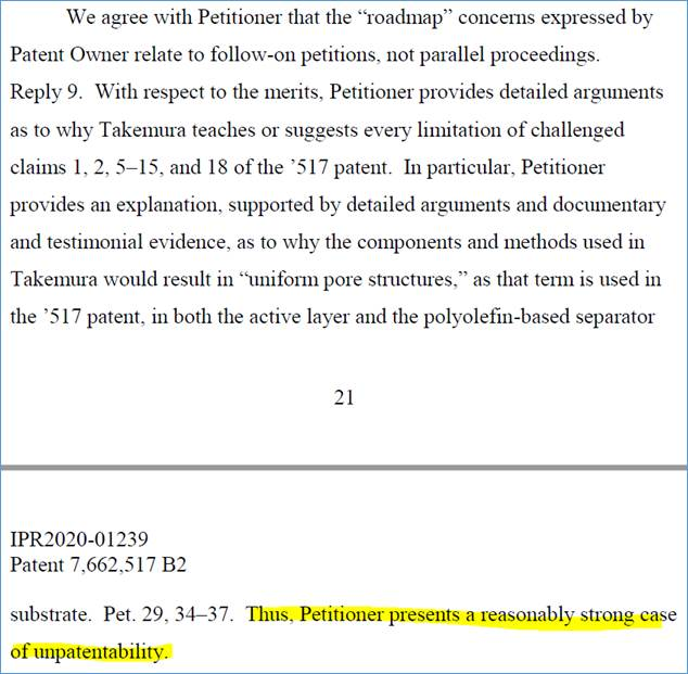 SKI는 "PTAB는 IPR을 각하하면서 그 결정 이유에 '특허의 무효성과 관련해서는 SKI가 제기한 8건 중 6건에 대해 SKI가 합리적인 무효가능성을 제시했다고 판단'했고, 특히, ‘517 특허에 대해서는 강력한 무효 근거(a reasonably strong case on unpatentability)를 제시했다"고 강조했다.