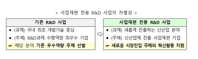 그간 사업재편 추진 기업은 새로운 분야 경험 부족으로 역량의 우수성을 기준으로 선발하는 기존 정부 R&D 참여가 어려운 경우가 많았다.