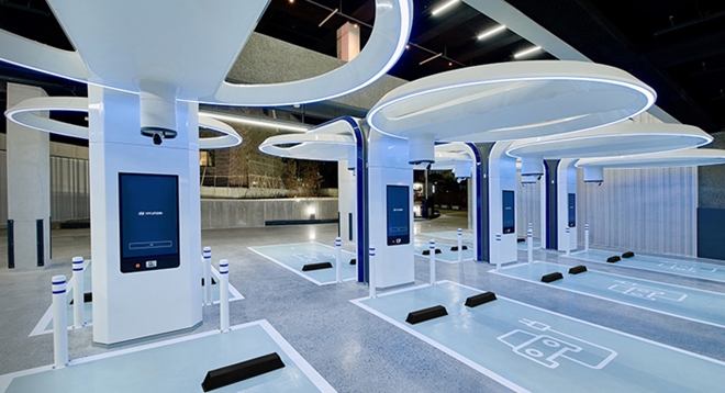연면적 4,066㎡(약 1,230평) 규모의 ‘현대 EV 스테이션 강동’에는 현대자동차가 개발한 전기차 초고속 충전설비 ‘하이차저(Hi-Charger)’ 총 8기가 설치되어 있다.