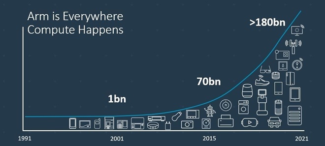이는 초 당 약 842개의 칩이 출하되는 것과 동일한 속도다. 현재까지 Arm 파트너사들은 총 1800억 개 이상의 Arm 기반 칩을 출하했다.