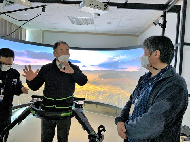 ▲정진우 중진공 기업지원본부장이 기업을 방문해 해상플랜트 시뮬레이터(디지털트윈)을 체험하고 있다.(출처 : 중진공)