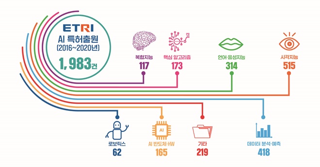 한국전자통신연구원(ETRI)은 지난 2016년부터 최근 5년간 1983건의 인공지능(AI) 분야 국내·외 특허출원을 완료했다고 밝혔다.