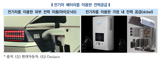 전기차에 탑재되는 고용량 배터리의 경우, 가정에서 약 10일 간 사용하는 전력을 저장할 수 있어 응급상황 전력공급 및 전력수급 안정화 등의 역할 수행이 가능할 것으로 보인다.