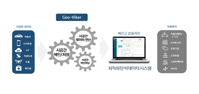 디토닉이 개발한 지오하이커(Geo-Hiker)는 시공간 데이터 처리 및 분석을 빠르게 할 수 있도록 도와주는 일종의 가속엔진과 같은 기술이다. 데이터의 시간과 공간의 특징에 따라 최상의 인덱싱 알고리즘이 적용 된다는 것이 특징이다. 또한 더욱 신속한 데이터 처리를 위해 노드 간 데이터 분산 최적화 기술을 탑재해 데이터 처리 성능을 극대화했다.