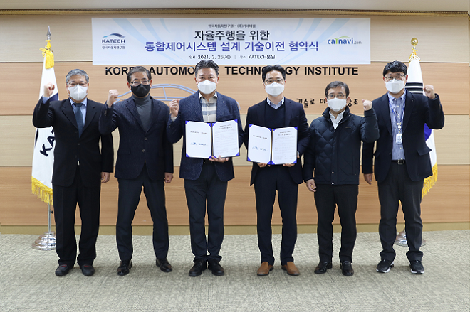 ▲지난 25일, 한국자동차연구원과 카네비컴이 충남 천안시 본원에서 '자율주행을 위한 DCU 제어기 설계 기술이전 계약'을 체결했다. (출처 : 한국자동차연구원)