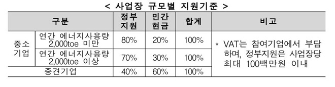 지원대상은 스마트그린산단에 입주한 산업·발전부문 중소·중견 사업장이다. 지원 예산은 11.9억 원이며 사업장 규모 및 연간 에너지사용량별 차등지원한다. 중소기업은 총투자비의 70~80%, 중견기업은 40% 이내로 지원한다.