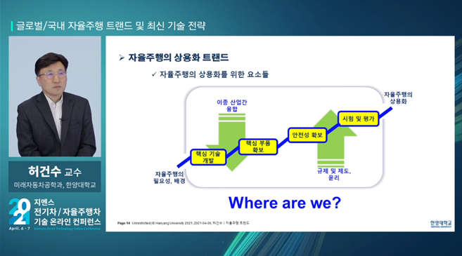허건수 한양대학교 교수는 지난 6일 지멘스 디지털 인더스트리 소프트웨어가 주최한 ‘2021 지멘스 전기차/자율주행차 기술 온라인 콘퍼런스’에서 ‘글로벌 국내 자율주행 트렌드 및 최신 기술 전략’이라는 주제로 발표를 진행했다.