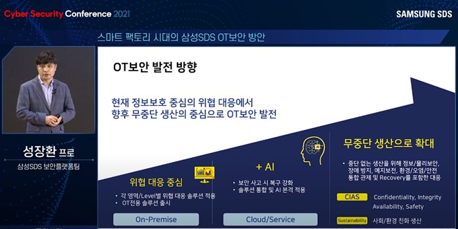 성장환 삼성SDS 보안플랫폼팀 프로도 스마트팩토리 시대 OT보안성에 대해 강연했다. ICT기술을 적용한 스마트팩토리는 공정 데이터를 실시간으로 수집하고 이를 분석해 생산성과 품질에 혁신적인 변화를 추구한다.