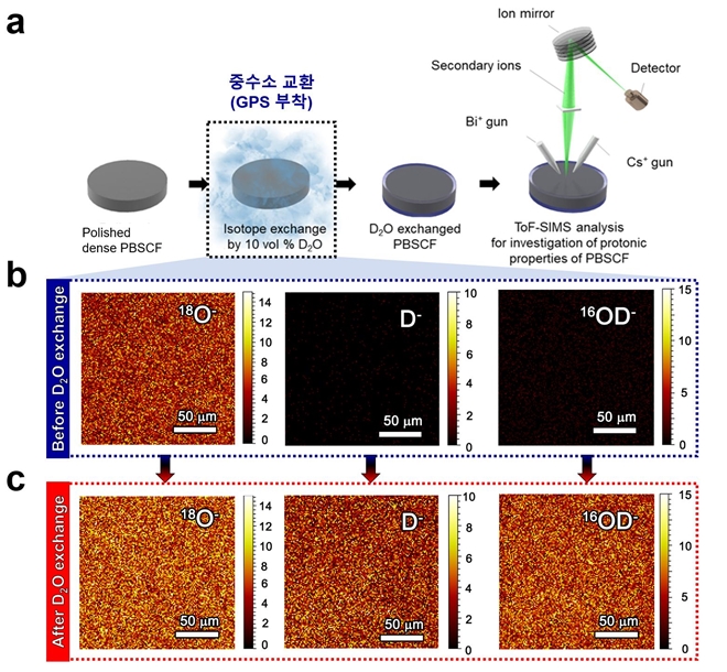 연구진은 수소를 더 무거운 동위 원소인 중수소로 바꾼 뒤 이를 추적하는 기법을 썼다. 고온을 이용해 중수(중수소가 많이 포함된 물, D2O)를 이중층 페로브스카이트에 주입한 뒤 이중층 페로브스카이트 절단면을 훑어가면서 중수소 이온의 농도 변화를 측정(동위원소 교환 확산 프로파일)했다. 단면 위치별로 농도차를 이용하면 수소이온이 얼마나 빠르게 이동하는지를 간접적으로 알 수 있다.