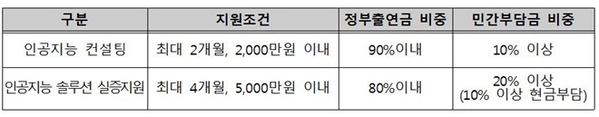 ▲인공지능 컨설팅 및 실증지원 사업 지원개요(출처 : 중기부)
